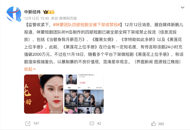 在《黑莲花上位手册》宣告下架一个月之后,咪蒙团队制作的四部短剧被全网下架。(图/微博)