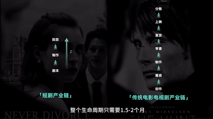 和传统的影视变现不同,短剧是“结果导向”的。一部短剧开机一周后便杀青,经过二十几天的后期制作剪辑,就可以投入市场发行,完成流量转化。这与传统影视需要历经筹备、建组、制作、宣发等流程相比快得多,收入回报也快得多。