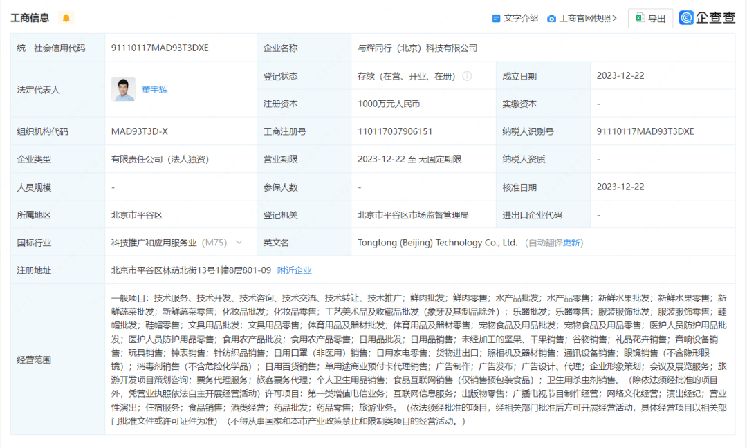 企查查显示,成立于2023年12月22日的与辉同行(北京)科技有限公司,由北京新东方迅程网络科技有限公司全资持股,注册资本1000万元,董宇辉担任法定代表人、执行董事、经理,俞敏洪担任监事并为公司实控人。