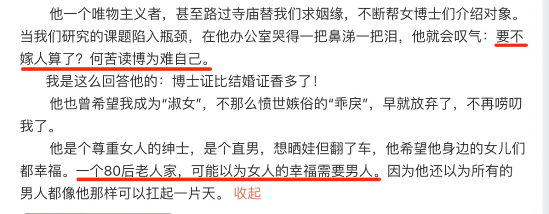 甚至,还觉得女人读博是为难自己,认为女人的幸福需要男人。