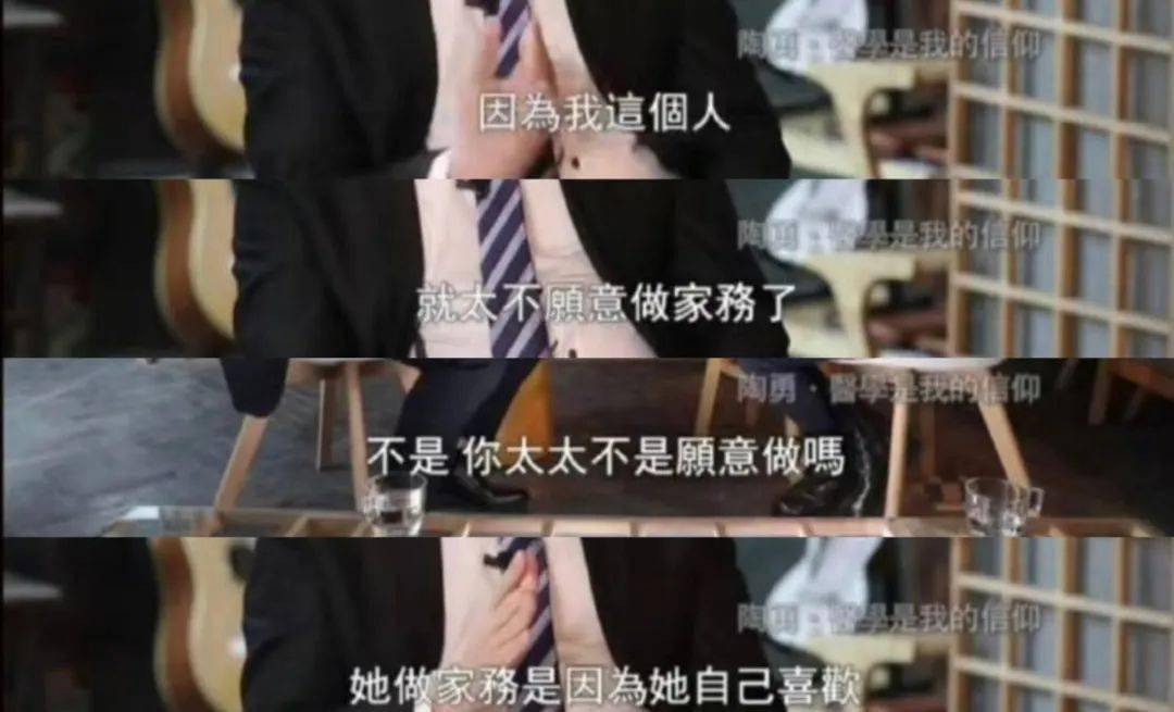 查了一下,陶勇是1980年生人,也许他的妻子的确是深受贤惠持家那套叙事影响,在家务的劳碌中自我感动,而这或许就是他们的相处模式。