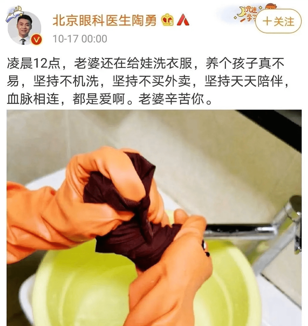 半夜十二点,妻子手洗衣服,他拍个照片夸赞老婆辛苦。