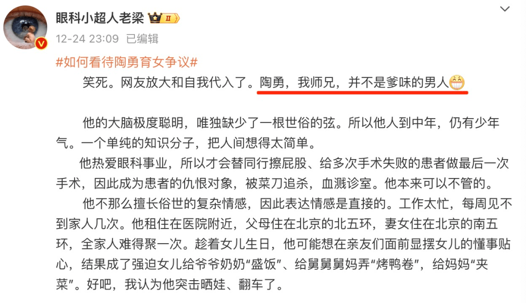 早在陶勇因那条微博引发风波之时,一个自称陶勇师妹的博主就站出来替陶勇接子弹,列举了陶勇种种,以力证“我师兄并不是爹味的男人”。