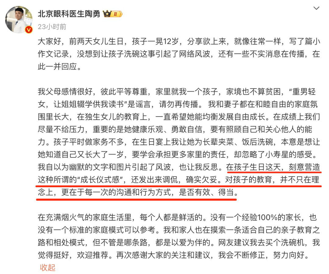 “生日事件”引发了广泛讨论后,陶勇很快出面发文回应。