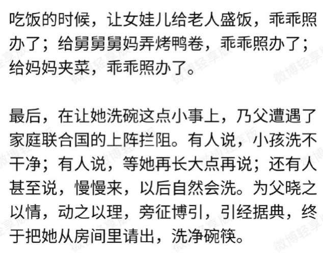 先是要孩子盛饭布菜,体现贴心孝顺,后是让孩子出门洗碗,“晓之以情动之以理旁征博引引经据典”,非让孩子照办不可。