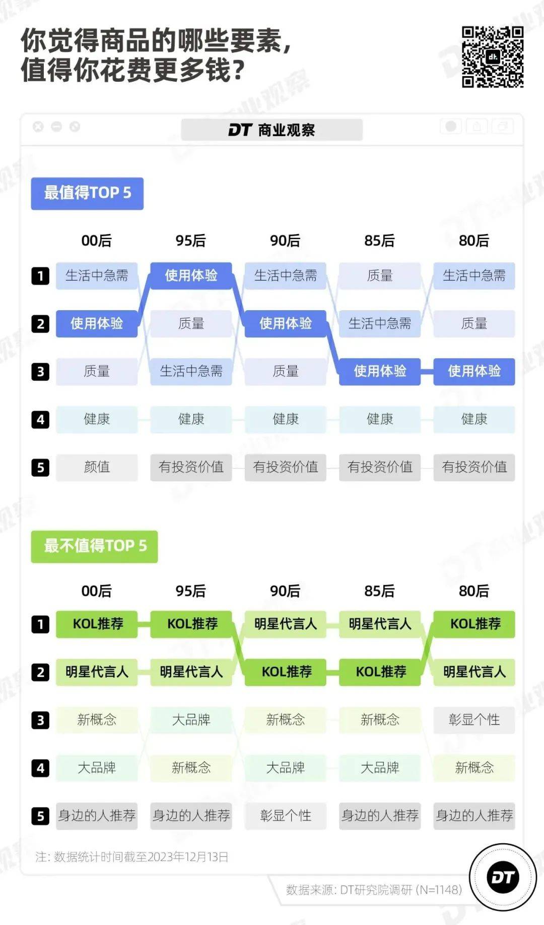 今年12月初,《DT商业观察》发布了一份《2023青年消费调研》,总共有1148受访者参加。其中近7成为女性、8成左右为90后、95后和00后,9成人来自一线、新一线及二线城市。