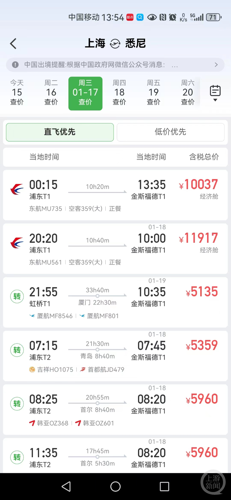 就上海龚先生买6000多元机票最后退款269元的情况,上游新闻记者首先查询了某票务软件,东方航空上海-悉尼的机票价格为:1月15日20点20分 13737元;1月16日0点15分 10037元、20点20分 8407元;1月17日0点15分 10037元、20点20分 11917元。因此此前上海龚先生6000多元购买的机票疑为打折机票。