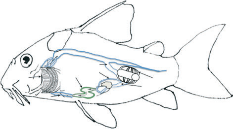 很多鲇形目鱼类(鲶鱼)都具有短暂在陆地上呼吸的能力,图为鲇形目鱼类用肠道呼吸的示意图。(图/onlinelibrary)